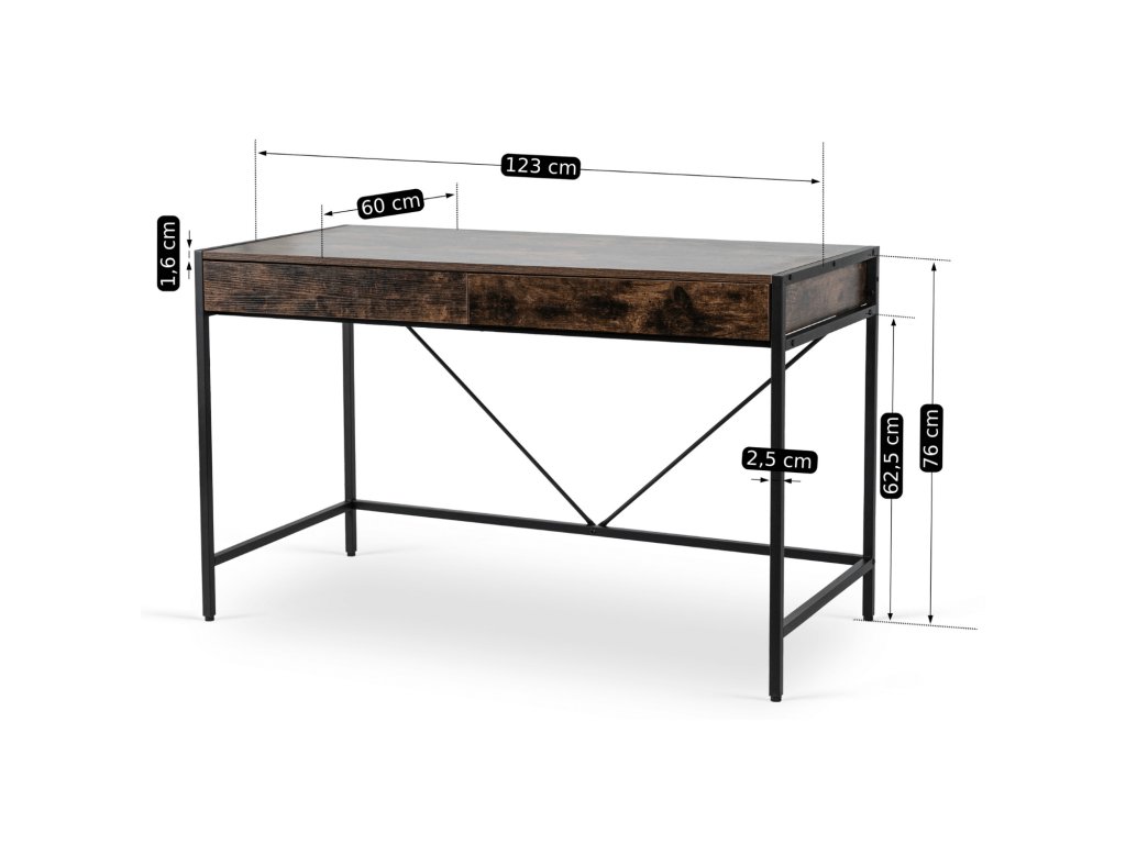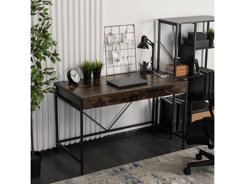 Der Tisch verfügt über eine großzügige Arbeitsfläche, zwei Schubladen und einen praktischen Organizer mit Ablagefach für kleine Gegenstände. Das durchdachte Ordnungssystem hilft, während der Arbeit den Überblick und die Ordnung zu bewahren.