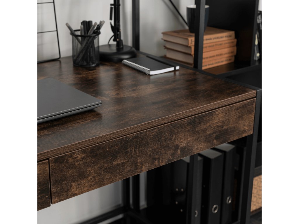 Die Arbeitsplatte, der Korpus und die Schubladen bestehen aus hochwertiger, laminierter MDF-Platte in der Farbe Goldeneiche. Die Kanten sind mit einer ABS-Schicht verstärkt, um eine längere Lebensdauer zu gewährleisten. Die Tischbeine bestehen aus schwarz lackiertem Stahl, der Stabilität und Widerstandsfähigkeit garantiert.